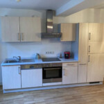- Komplett eingerichtete Küche mit E-Herd, Backofen, Kühlschrank mit Gefrierfach, Spülmaschine, Kaffeemaschine und Wasserkocher
